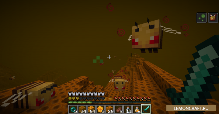 Мод на пчелиное измерение The Bumblezone добавляет в игру новое измерение, которое позволит попасть вам внутрь пчелиного улья и исследовать его. Само измерение состоит из сот, блоков меда и пористых блоков. Исследую данный мир вы должны быть очень осторожны, ведь пчелы, которые собирают там мед, очень опасны. Перейдя в новое измерение вы будете перемещаться так же, как и в нижнем мире, один блок нового измерения будет равен 10 блокам в реальном мире.